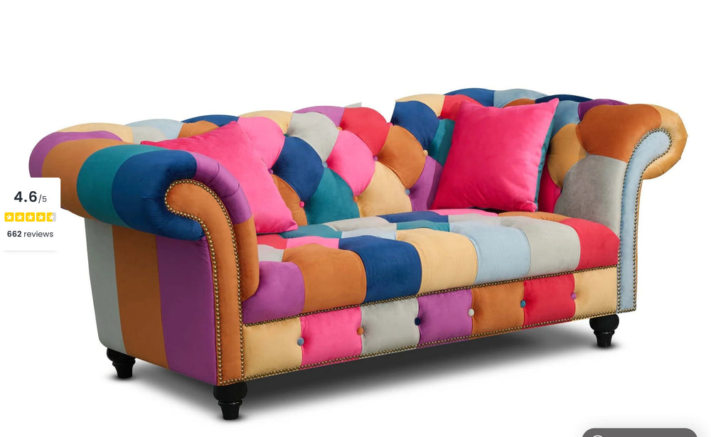 Multicoloured Velvet Patchwork 2 Seater Scroll Arm Chesterfield Sofa