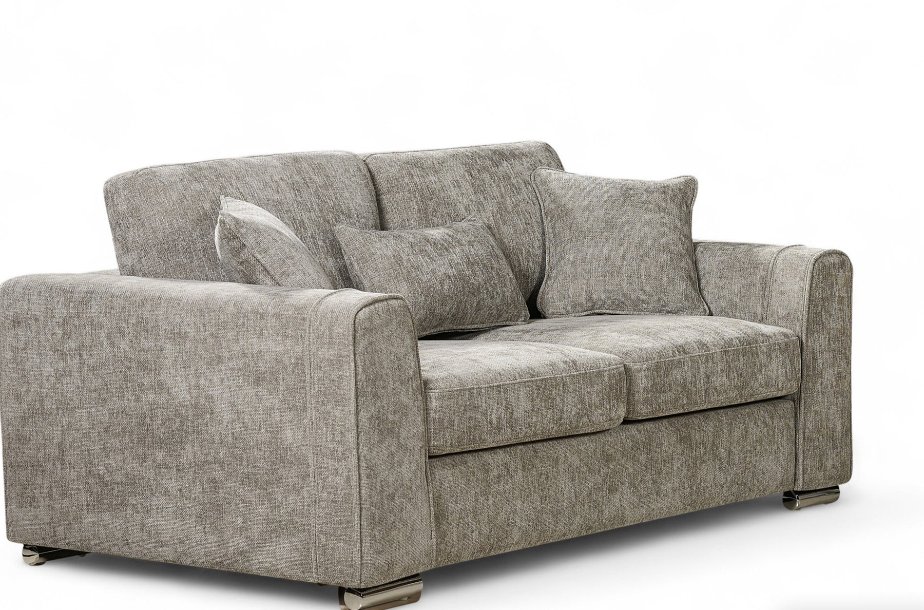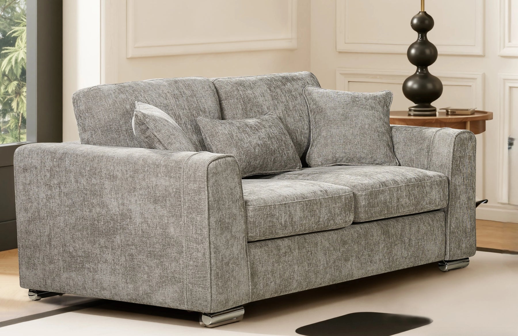 The Grey Chenille Fabric Logan 2 Seater Sofa showcases a sleek, contemporary silhouette upholstered in a soft, textured chenille fabric in a versatile grey tone. Designed for everyday comfort, it features fixed back cushions and generously padded seats. Straight arms and silver modern legs lend it a refined, well-proportioned appearance, while two matching scatter cushions complete the look.