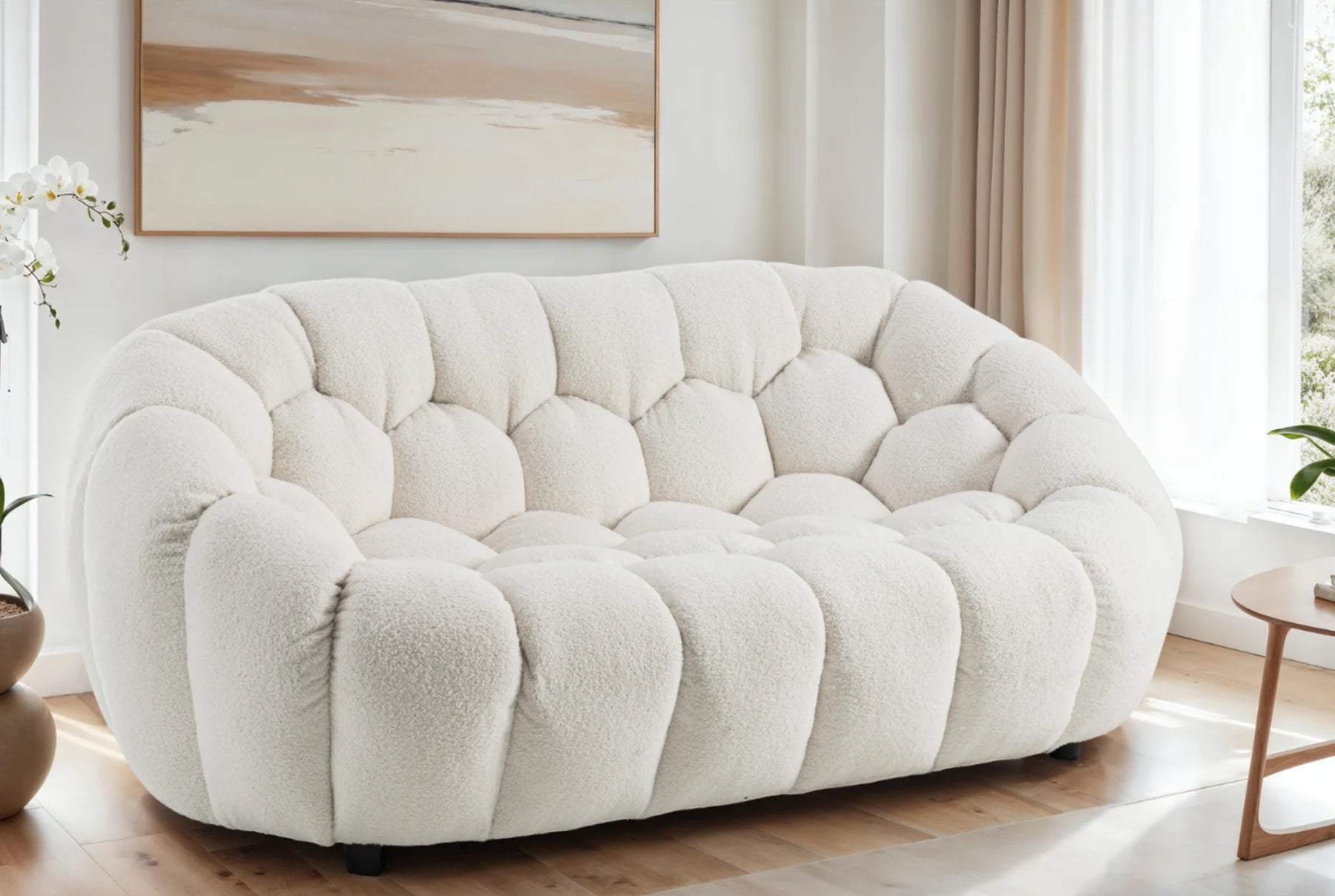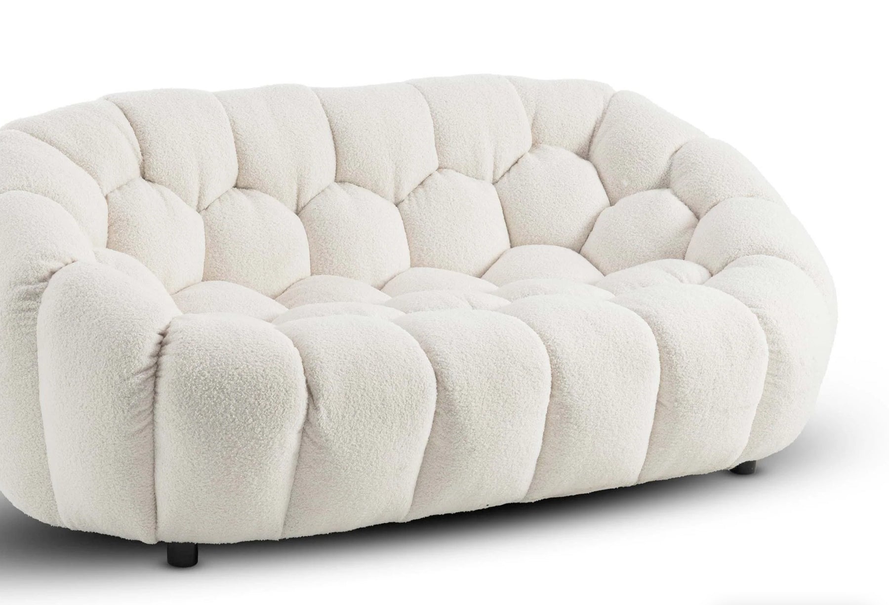 The Atrani range boasts a unique low seating height profile and a distinctive round sectional silhouette, reminiscent of a cloud-like shape, perfectly complementing its curly upholstery. It's ideal for creating a cosy nook in your living room or as part of a chic lounge setup.