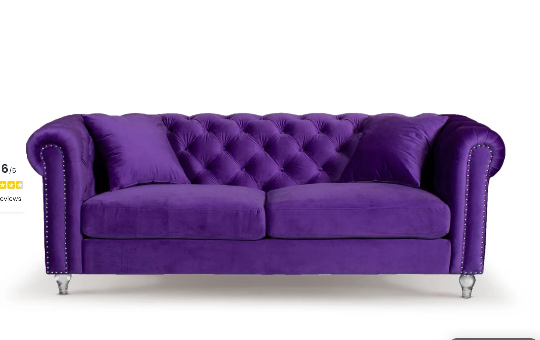 The Velvet Camden Purple 3 Seater Chesterfield Sofa with Acrylic Feet is a beautiful, stylish addition to your living room. Upholstered in polyester velvet fabric, this sofa displays a smooth sheen that adds a touch of elegance. The sofa features a classic Chesterfield design, with a modern twist thanks to its contemporary features. The Chesterfield silhouette offers elegant scroll arms adorned with decorative studs and deep buttoning on the backrest section, offering a touch of sophistication to any room it is in.