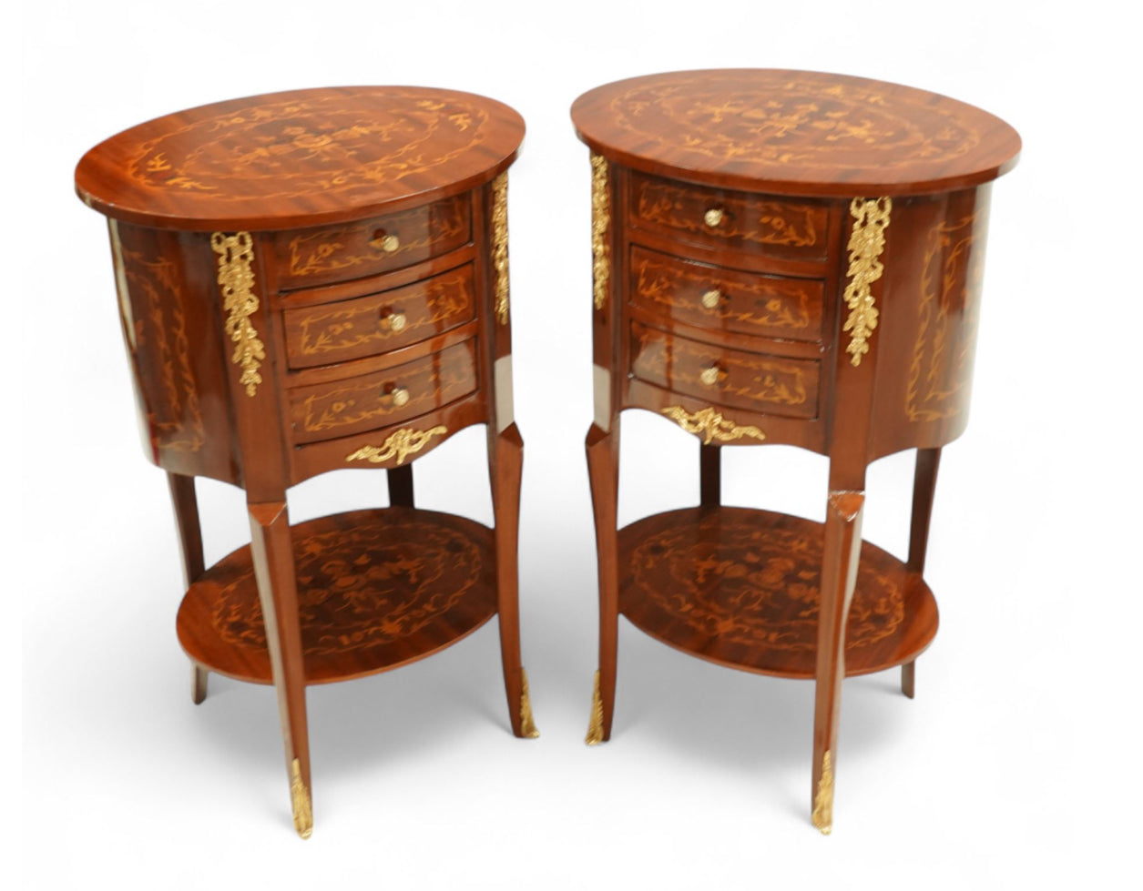 Pair of Louis XVI style 20th-century marquetry bedside tables, inlaid oval top of floral bouquet design above three short drawers, gilt brass mounts decorate the front and the feet, inlaid side panels, and oval stretcher base, supported on straight tapered sabre legs with chamfered knee