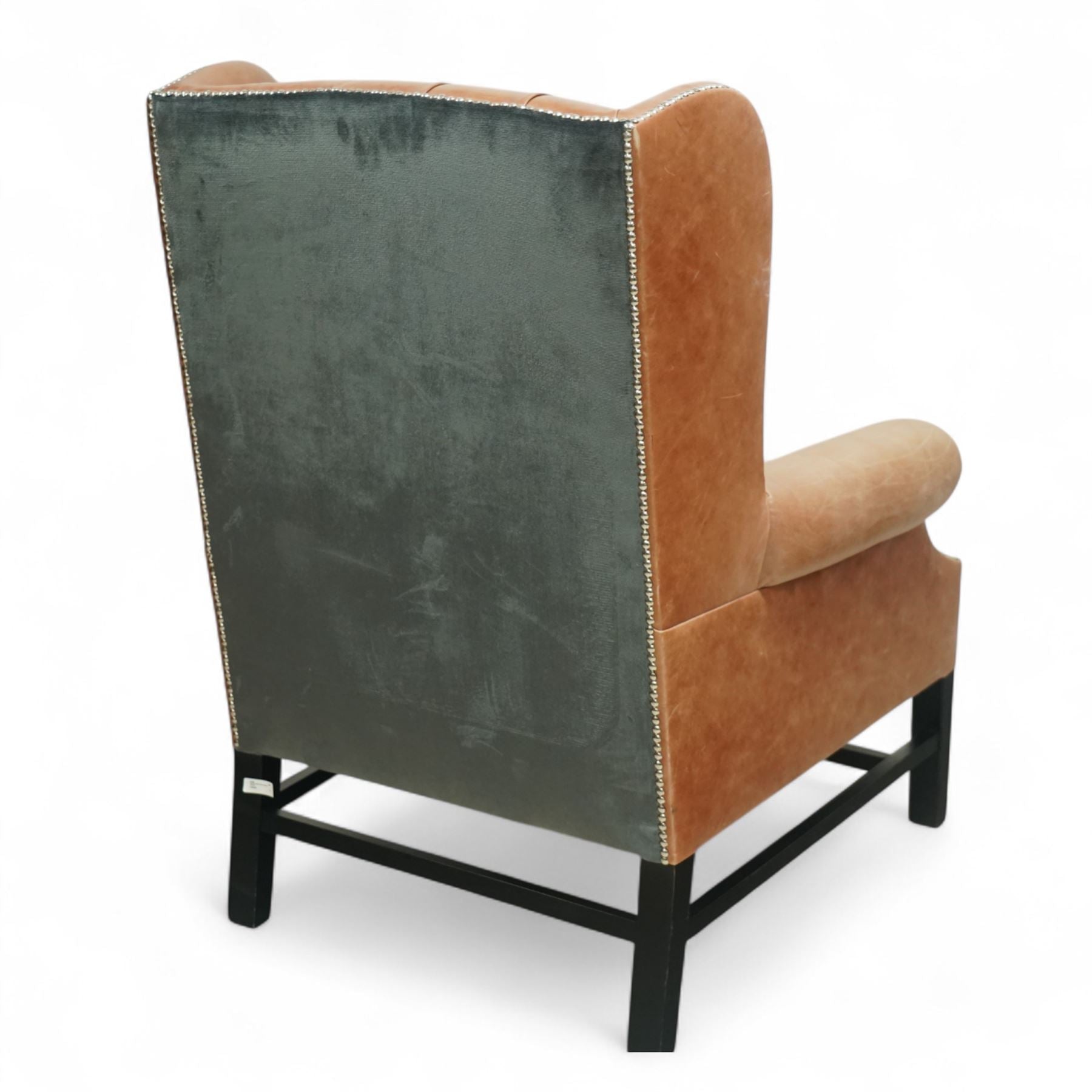 Presented by Pish Interiors & Antiques, this sophisticated pair of contemporary wingback armchairs is upholstered in rich tan leather, combining timeless craftsmanship with modern appeal.