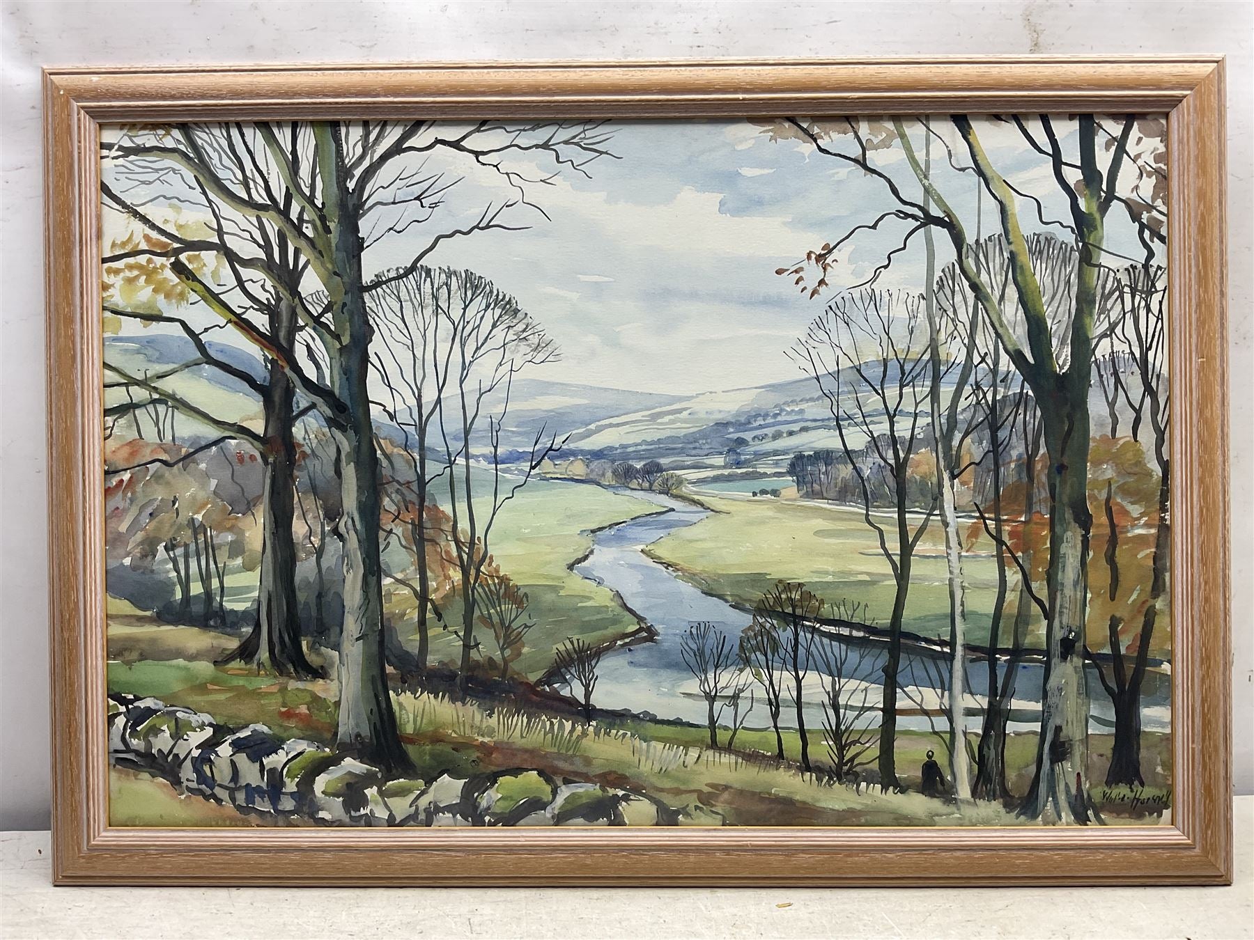 Horsnell's skilful use of watercolours brings to life a serene landscape, showcasing a picturesque valley bathed in natural light. The artist's signature adds a personal touch to this evocative scene, measuring 49cm x 74cm.