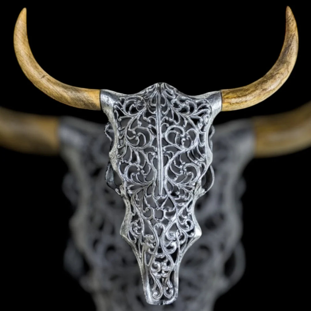 Silver Bison Skull Wall Mount - Antique Aluminium and Wood Tribal Decor