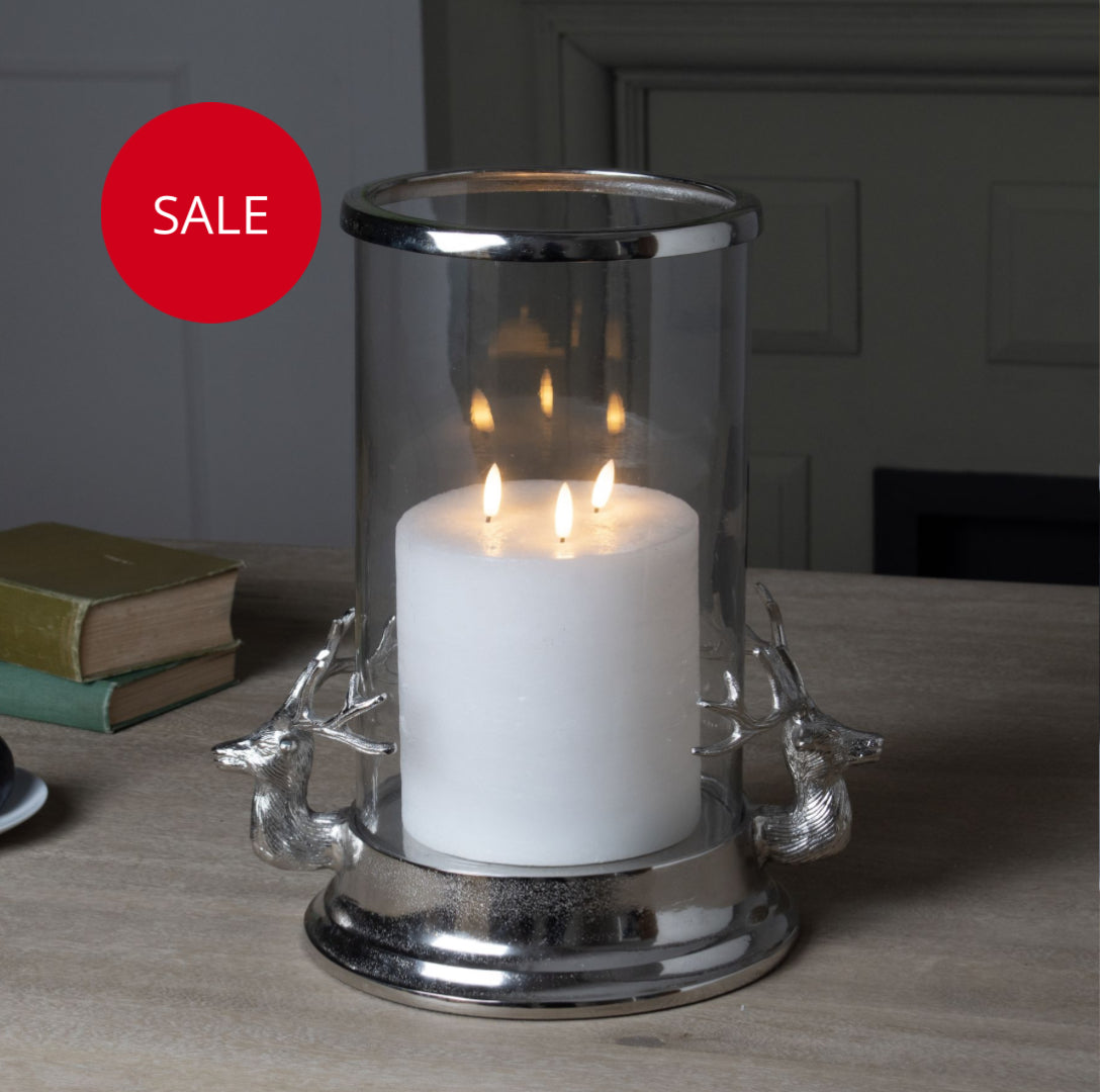 Exquisite Silver Stag Heads Hurricane Lantern merges woodland charm with luxury. Versatile for rustic or contemporary spaces, it's a year-round showpiece. A must-stock item to captivate discerning customers.