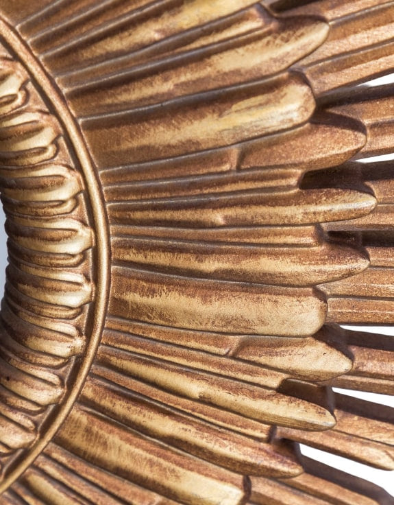 Infuse your space with celestial charm using this radiant Large Antique Gold Sun Mirror. Featuring bold sculpted rays in varying textures and lengths, this mirror captures the elegance of vintage sun motifs around the central mirror glass. The antiqued gold finish adds warmth and drama—ideal for adding dimension and vintage glamour to any wall.