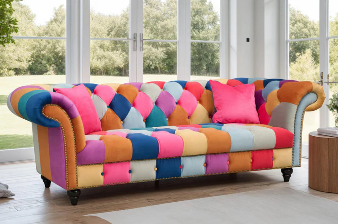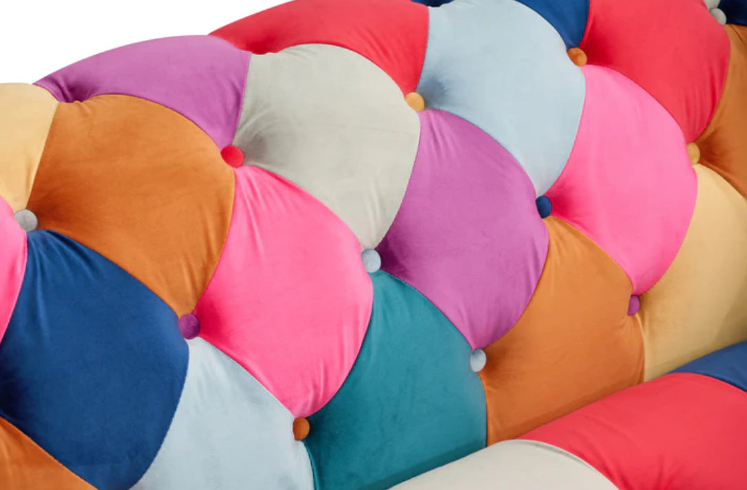 The Chesterfield Sofa is a vibrant and contemporary centrepiece that brings bold personality to any living space. Upholstered in a luxurious velvet patchwork, this eye-catching sofa blends the timeless elegance of classic Chesterfield design with a playful, modern twist.
