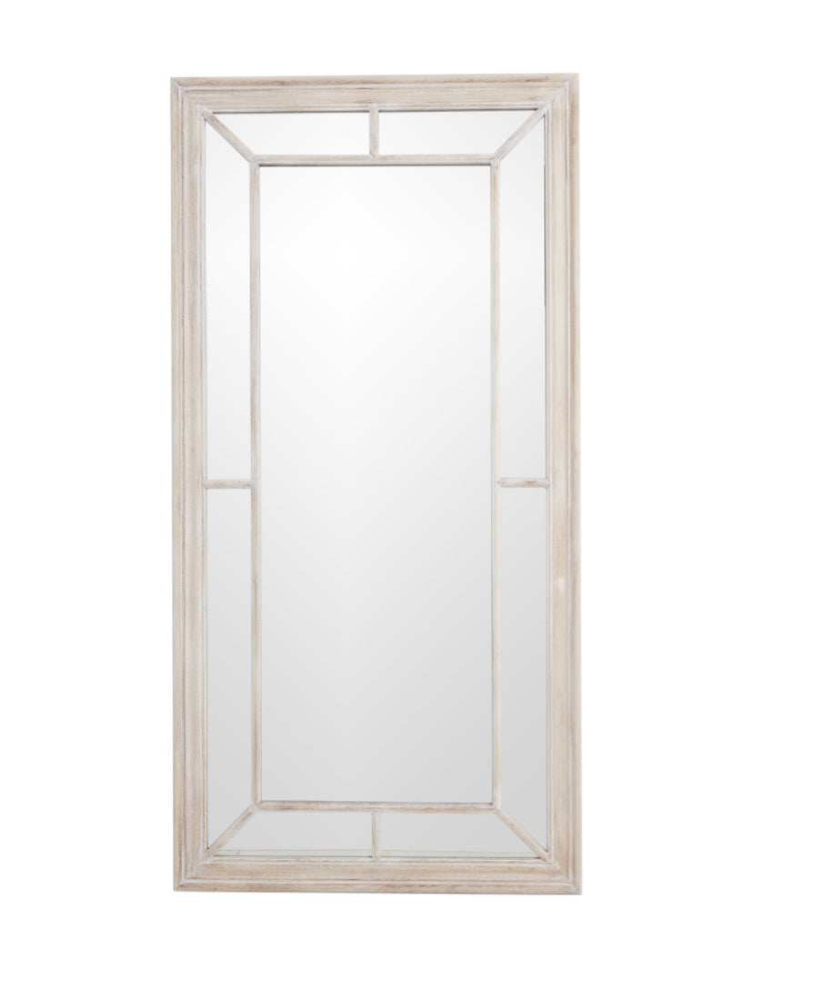 Weathered wood frame mirror with architectural window panes. Creates illusion of space. Perfect blend of rustic and refined style.