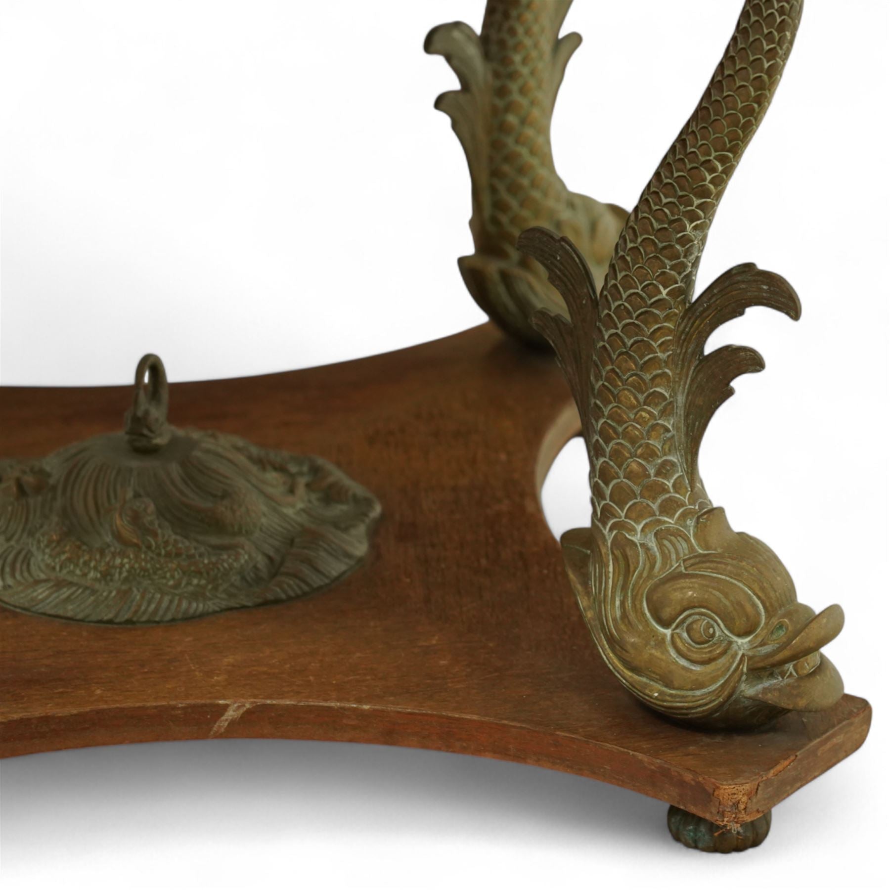 The piece is raised on a shaped wooden plinth base, centred with a cast shell and wave-form finial, adding a whimsical maritime touch to its refined aesthetic.