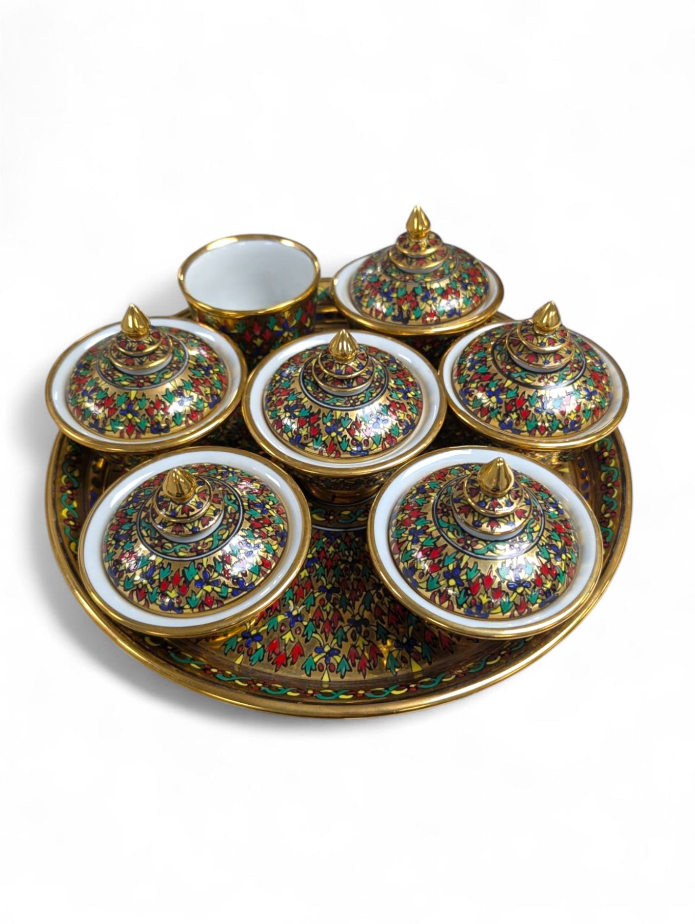 Discover a stunning Benjarong-style tea set offered. This finely crafted set comprises six intricately decorated cups with matching lids, presented on a coordinating tray.